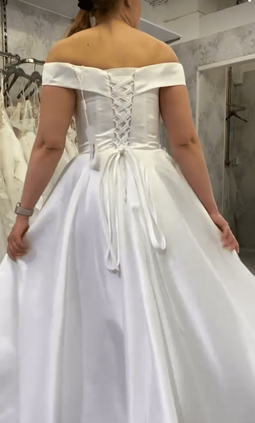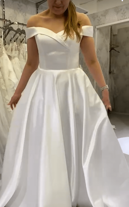 Dazzling -merkin veistoksellisessa satiinipuvussa on kellotettu helma ja off shoulder -olkaimet muodostava pääntie. Laahukseton puku istuu napakasti nyörityksen ansiosta ja siinä on taskut. Koko 40, hinta 390€