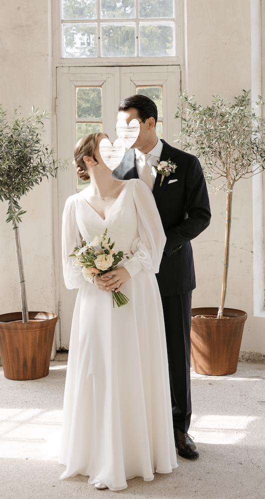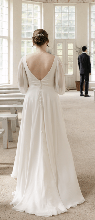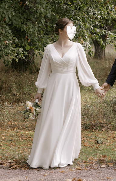 Sincerityn malli 44264 on A-linjainen sifonkipuku pitkillä hihoilla ja maltillisella laahuksella. Puvussa on syvä v-pääntie edessä ja selässä, vyötäröä korostavat veistokselliset vedostukset. Hulmuavien hihojen mansetteja ja selkää koristavat sirot koristenappirivistöt. Koko 38, hinta 790€