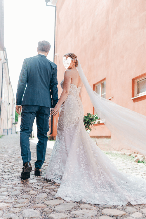 Maggie Sotteron Fairchild sävyssä blush on upea merenneitopuku, jota koristaa lehdykkämäinen pitsikuviointi. Paljettikirjaillut pitsiaplikaatiot nousevat upeasti esiin sävytettyä pohjakangasta vasten, kevyessa puvussa on olkaimeton sweet heart -pääntie. Koko 38/40, hinta 890€