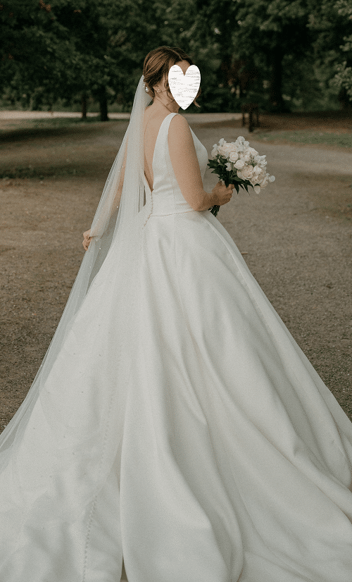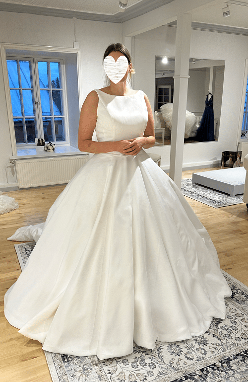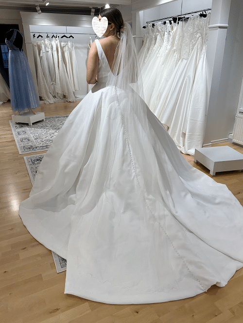 Demetrioksen näyttävässä satiinipuvussa on olkaimellinen yläosa venepääntiellä, joka takana avartuu paljastaen selkää vyötärölle saakka. Klassisen tyylikkäässä puvussa on siro rusettivyö ja muhkea kellohelma ihanan pitkällä laahuksella. Koko 40/42, hinta 890€