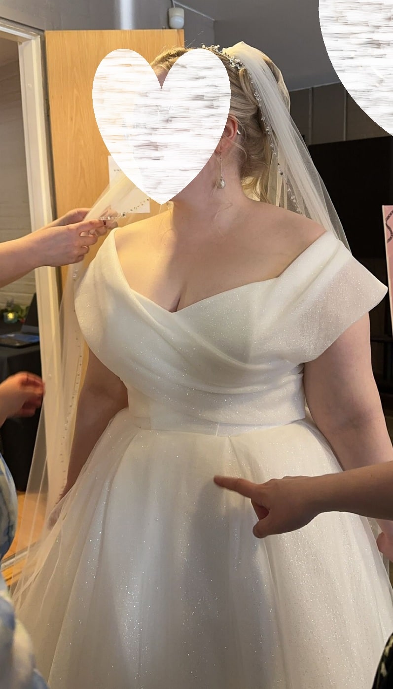 Libelle kimaltelevasta glittertyllistä tehty morsiuspuku Inez off shoulder olkaimilla ja prinsessahelmalla. Puvussa on nyörikiinnitys ja helmassa laahus. Koko 44, 750€