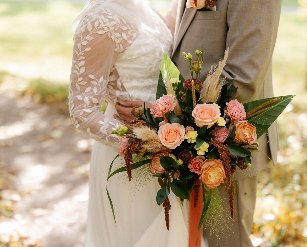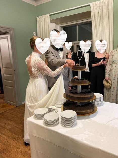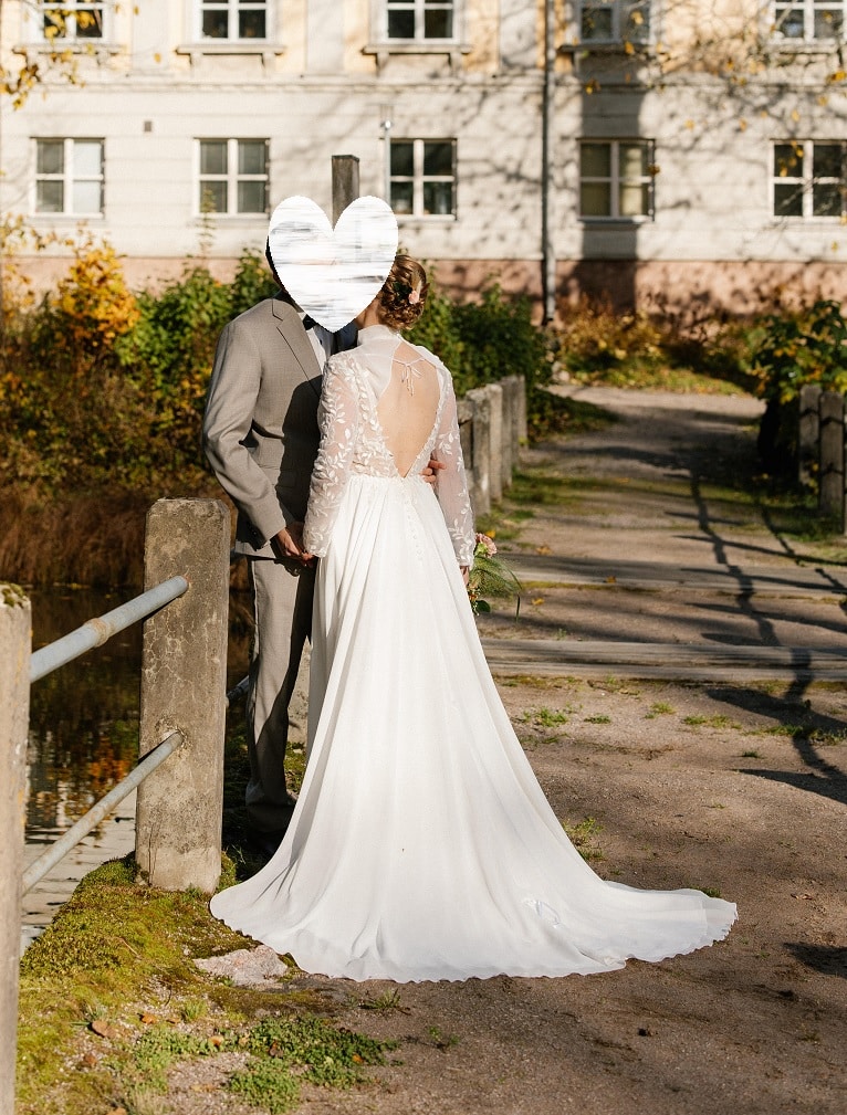 Abby Waits pitkähihainen häämekko Emmy on ompelijalla muokattu niin, että V-pääntiehen on lisätty sifonkia kauluriksi saakka ja selkä jätetty avoimeksi keyhole -tyyliin. Puvussa on laskeutuva sifonkihelma ja yläosassa kaunis lehtikuvioinen pitsikirjailu. Koko 40, 595€