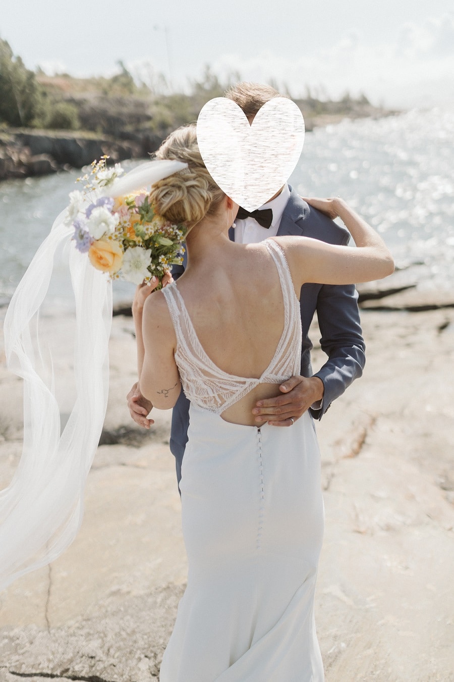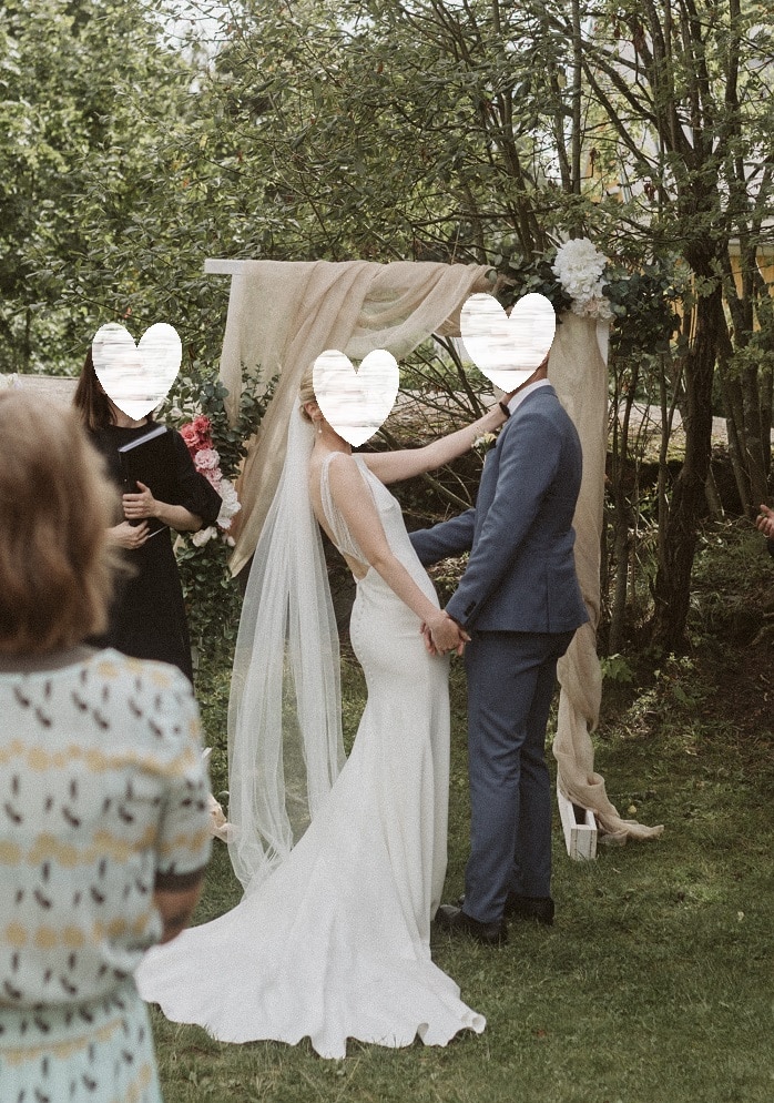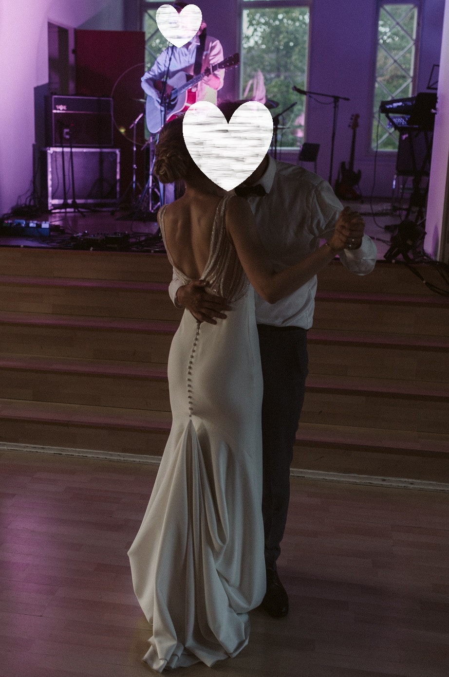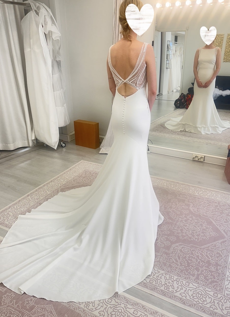 Modeca merkin kreppikankainen hääpuku Ruth on kapealinjainen ja siinä on näyttävä laahus. Puvussa on umpinainen venepääntie ja olkaimet, selä avoin selkä kirjailtu kauniilla helmillä. Koko 36/38, 750€