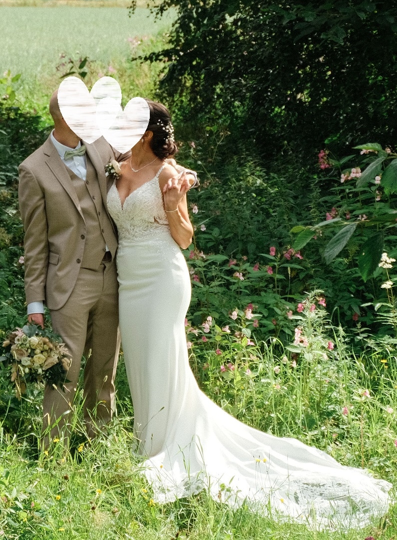Modeca kapealinjainen hääpuku Bluelle kreppikankaisella pohjalla ja upeilla pitsiyksityiskohdilla. Puvussa on sirot naruolkaimet ja avoin selkä. Näyttävässä laahuksessa on pitsireunus. Koko 36/38, 790€