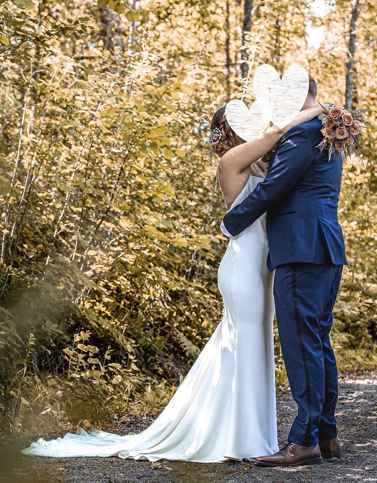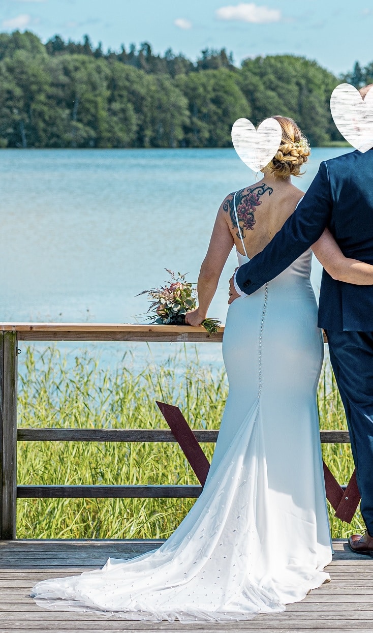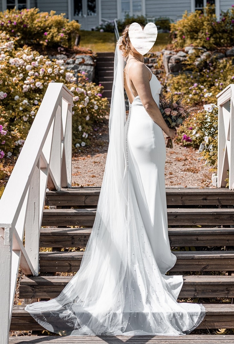 Heidi Tuisku Nikki on kapealinjainen laskeutuva kreppipuku olkaimilla ja suoralla pääntiellä. Puvussa on takana näyttävä isohkoin helmin kirjailtu tyllilaahus. Puvussa on takana vetoketjukiinnitys ja helminapitus. Koko 36/38, 690€ (hinnassa huomioitu helmaan jääneet tahrat)