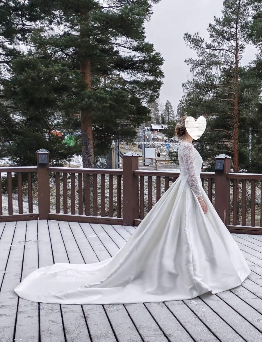 Pronovias prinsessahelmainen morsiuspuku Albion pitsiyläosalla, jossa on pitkät hihat ja V-pääntie. Vyötäröltä levenevä helma on mikadosatiinista tehty ja siinä on näyttävä laahus. Koko 36, 750€