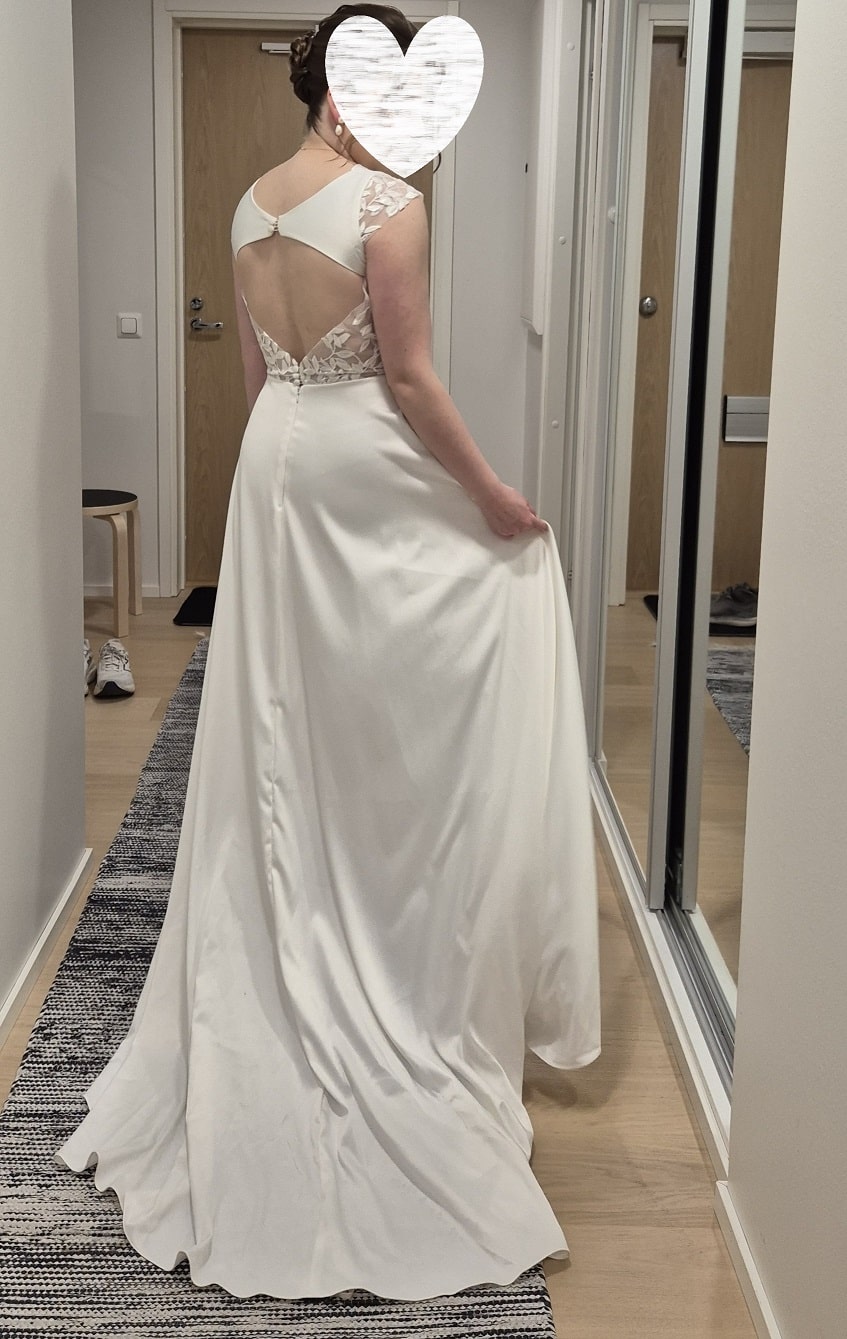 Batel Boutique satiinihääpuku kapeasti laskeutuvalla A-linjaisella helmalla. Puvussa on kietaisuhenkinen V-pääntie ja pienet pitsihihat, joiden pitsi jatkuu myös yksityiskohtana avoimessa keyhole -selässä. Puvussa on vetoketjukiinnitys ja laahus. Koko 38/40, 580€