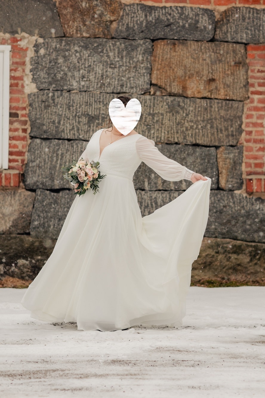 Bella by Amelie pitkähihainen hääpuku nro. 30159W pitsiyläosalla. Puvussa on A-linjainen vyötäröltä levenevä ja kauniisti laskutuva sifonkihelma laahuksella, pääntie on V-mallinen edessä ja takana. Koko 48, 800€