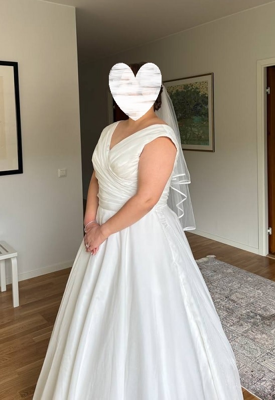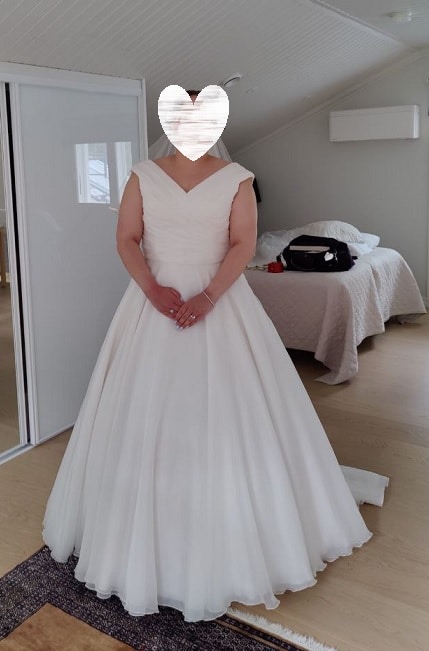 White Rosen kellohelmaisessa a-linjaisessa puvussa on vedostettu yläosa, josta muodostuu puvulle olkapäille olkaimet. Olkaimet muodostavat puvulle v-pääntien eteen ja taakse. Runsas mutta kevyt sifonkihema liikehtii kauniisti liikkuessa. Koko 46, hinta 450€ (puvun kunto huomioitu hinnassa)