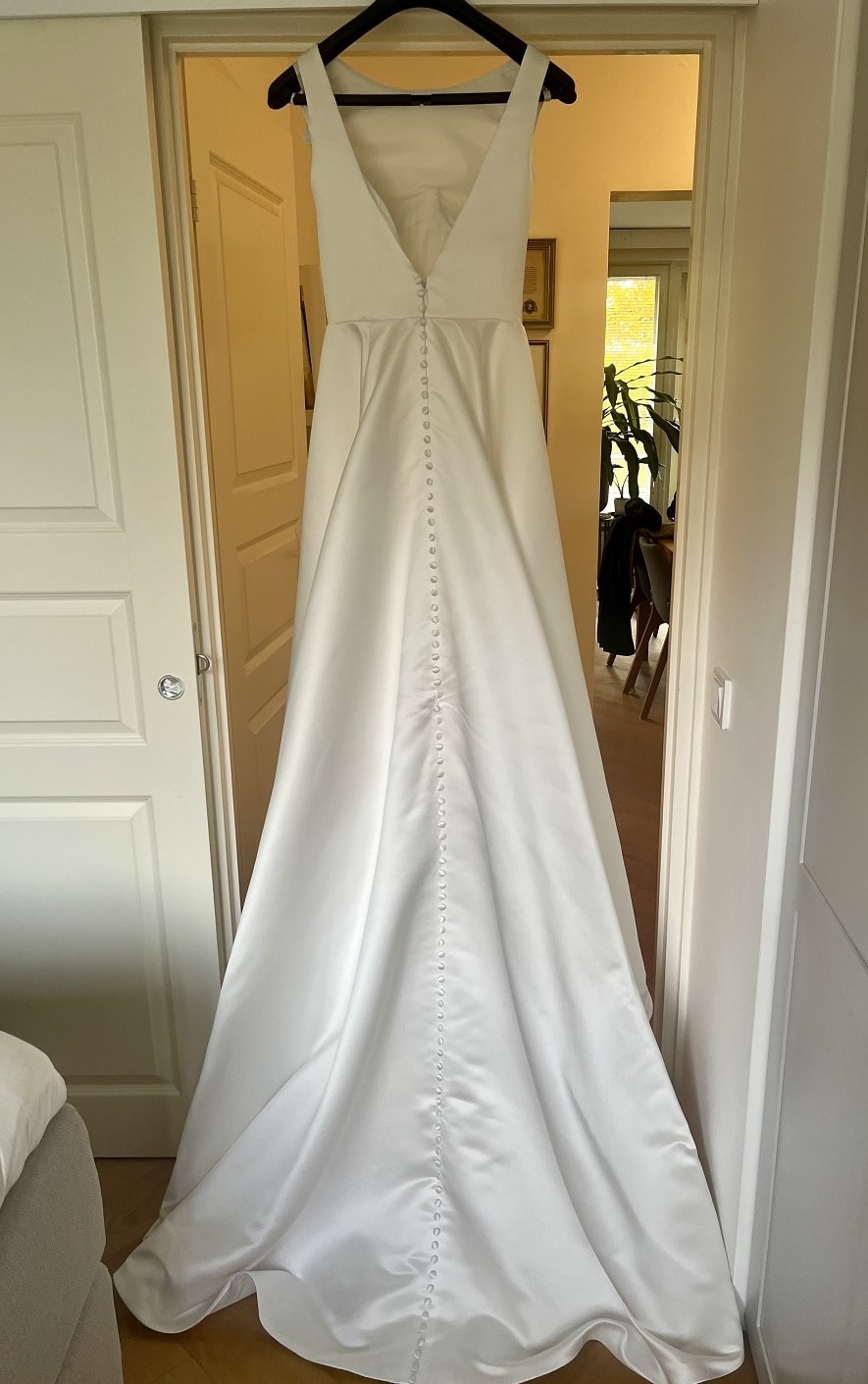 Sis idman Chanel on olkaimellinen a-linjainen satiinipuku. Puvun etuosaan muodostuu venepääntie ja takana olkaimet kehystävät syvään uurretua avointa selkää. Puvussa on takana vetoketjukiinnitys ja koristenapit aina laahuksen reunaan asti. Koko 36, 850€