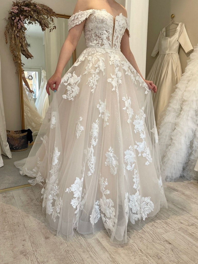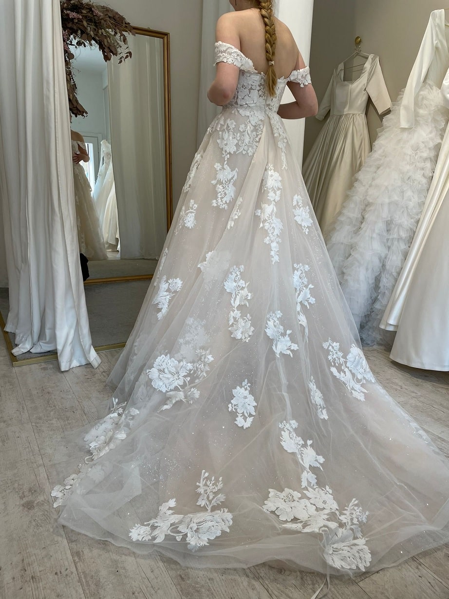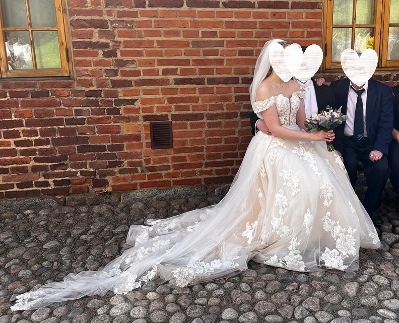 Sis Idman samppanjapohjainen Anastasia irrotettavilla off shoulder olkaimilla ja muhkealla A-linjaisella helmalla, jossa on laahus. Puvussa on syvään uurrettu sydänpääntie. Koko 38/40, 800€