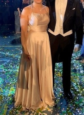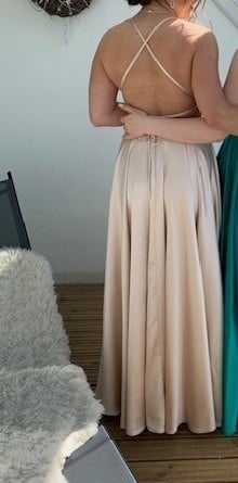 Samppanjan sävyinen laahukseton puku laskeutuvasta satiinista avoimella selällä. Puvussa on A-linjainen helma ja sirot selästä ristiin kulkevat naruolkaimet. Koko 36/38, 350€