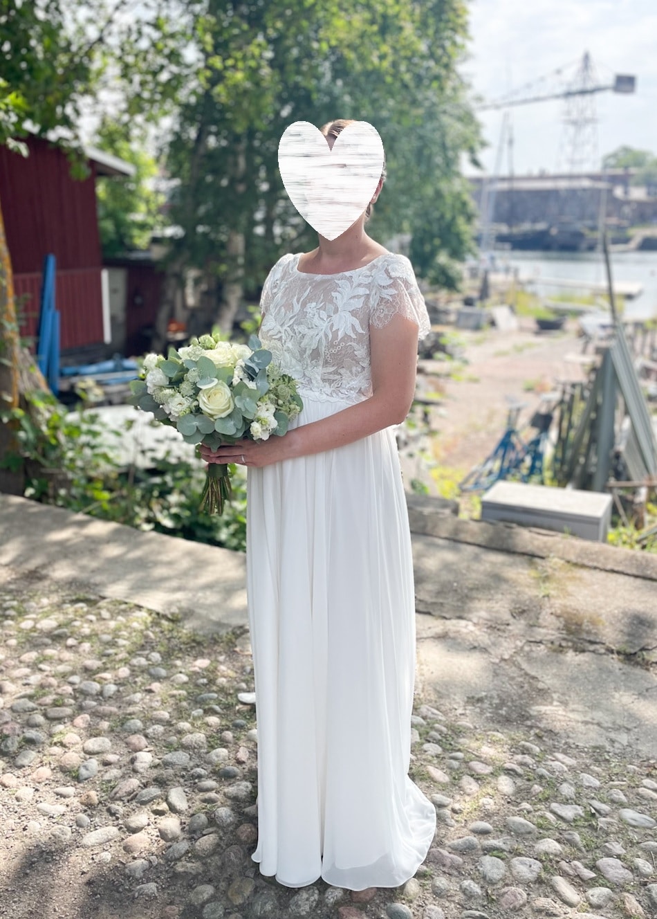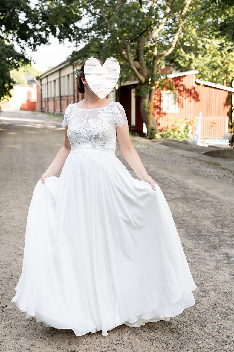 Heidi Tuisku Pieces mallistosta yhtenäseksi raskaushääpuvuksi koottu pitsinen Joanna yläosa ja laskeutuvasta sifongista tehty Kendra helma, minkä alle sopii suurempikin vatsa! Puvussa on maltillinen laahus ja pienet hihat, selän kiinnityksen kruunaa nappirivi. Koko 38/40, 750€