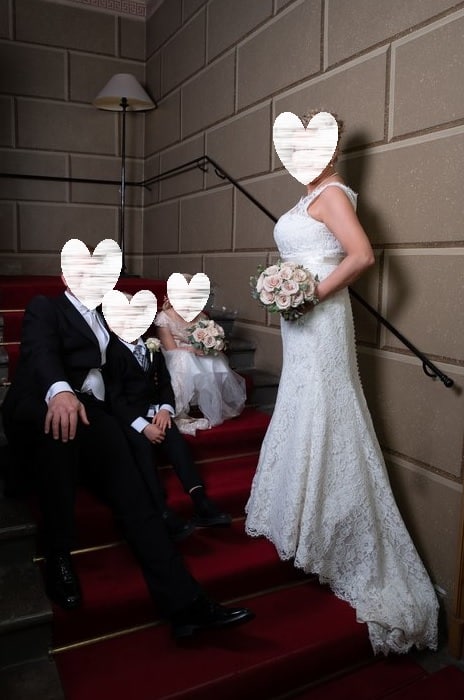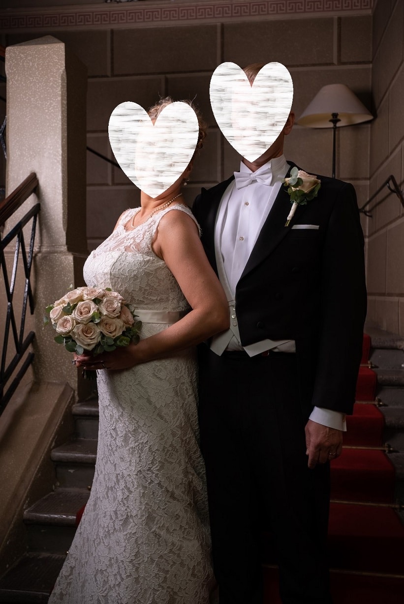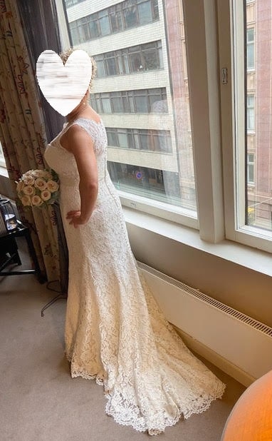 Koko White Rose hääpuku R704H on yhtenäistä ruusukuvioista pitsikangasta. Puvussa on leveät läpikuultavat olkaimet, joiden alta kuultaa sydänpääntie. Kapeassa helmassa on maltillinen laahus ja selässä vetoketjukiinnitys napein. Vyötäröä korostaa satiinivyö. Koko 42, 550€