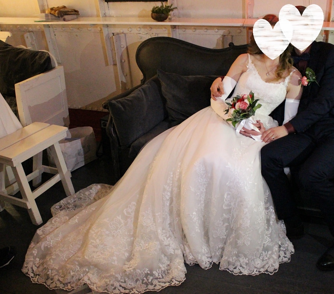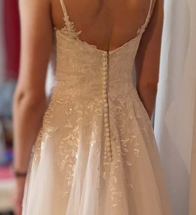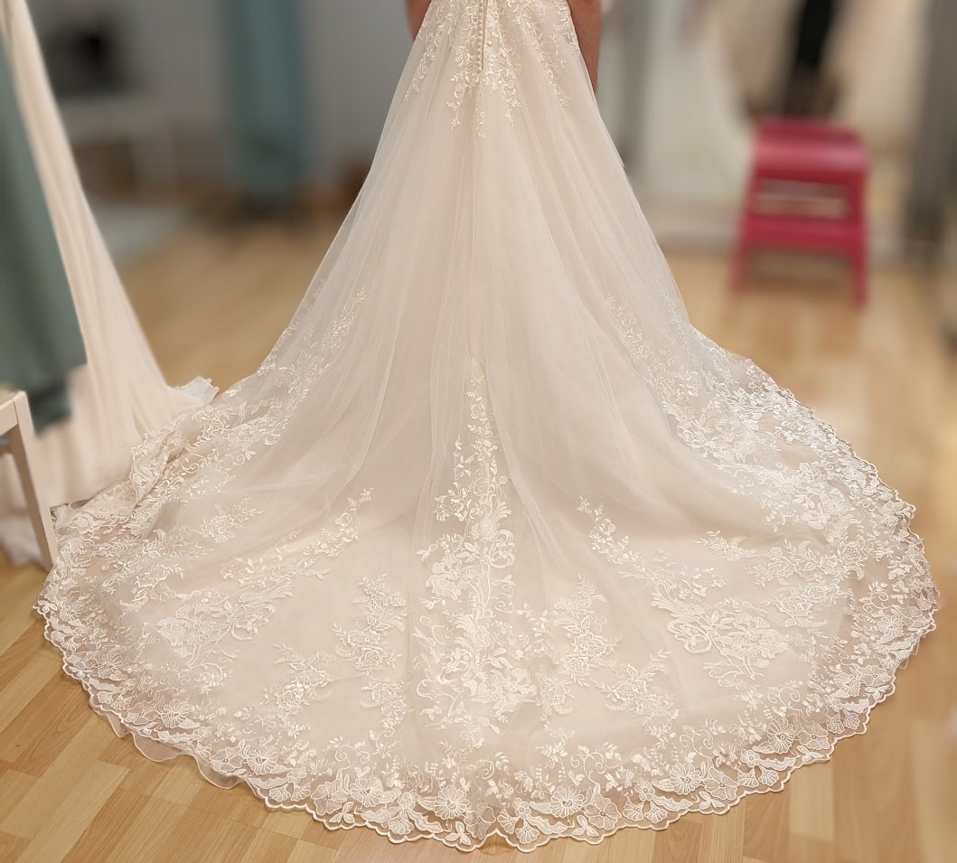 Maggie Sottero hääpuku Viola pitsiyläosalla ja siroilla olkaimilla. Vyötäröltä levenevä muhkea A-linjainen helma yhdistää tylliä ja pitsikirjailuja helman reunassa. Selässä on vetoketjukiinnitys napein ja näyttävä laahus. Koko 38, 680€